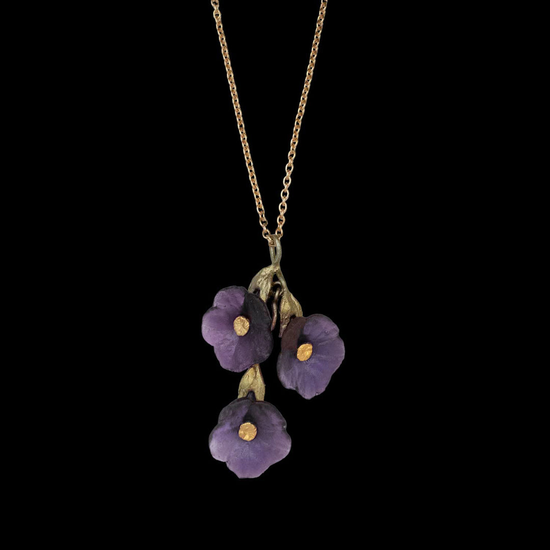 Crafted by hand from patinated bronze and coloured glass, these pieces capture the gentle curves and rich tones of the petunia’s petals. From the Petunia Pendant Necklace to the Petunia Drop Earrings, every detail is shaped from nature and refined through artistry. The result: jewellery that feels alive with movement, colour and meaning.