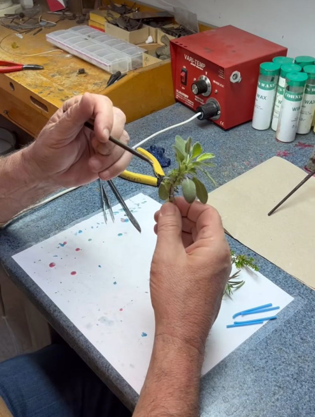 Our unique jewellery is made by creating moulds directly from botanical elements in a process similar to lost-wax casting. While traditional lost-wax casting begins with a hand-carved model of wax, Michael Michaud uses an actual leaf, branch or flower in place of the wax model. A mould is created around the botanical element and as it is heated the plant matter burns away and leaves behind a beautifully detailed mould of itself.