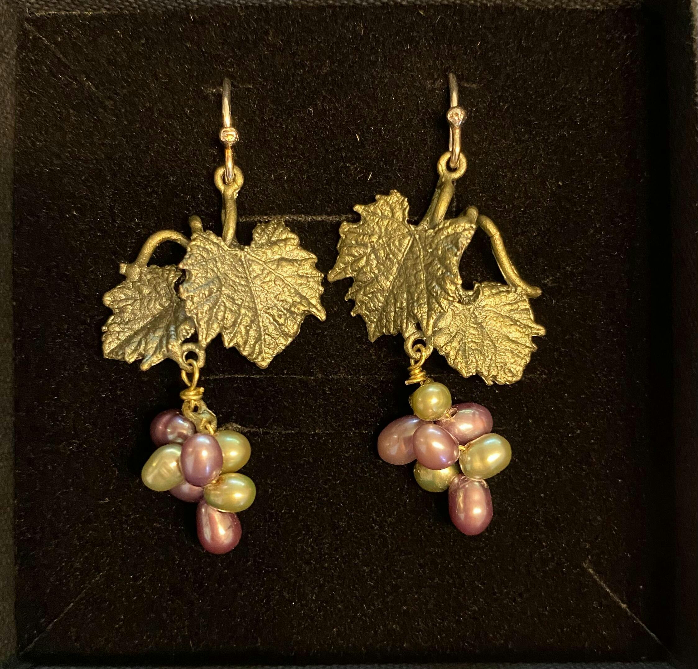 Materials: The Grape Vines earrings are cast in hand patinated bronze and accented with purple and pale green dyed freshwater pearls. The wires are 925 silver.