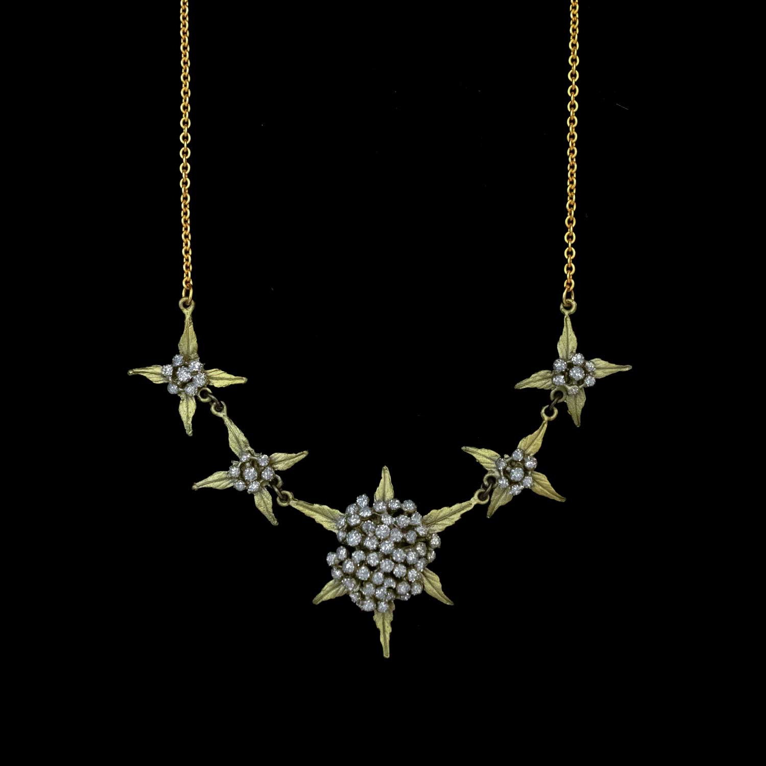 Materials: The Queen Anne's Lace necklace is cast in hand patinated bronze, accented with enamel and finished with a crystal dust.